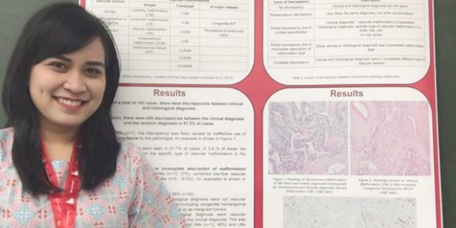 “Nah , ternyata di dunia pun seperti itu, jadi penelitian saya di negeri Belanda yang merupakan pusat rujukan kasus vaskular malformasi. Di Indonesia juga sudah banyak kasus yang dilaporkan terapinya jadi tidak efektif karena tidak spesifik Jadi ada 2 dokter (klinis dan pathologist) mereka kan memberikan diagnosis masing-masing dan itu 55.7% berbeda dan dua-duanya ada salahnya masing-masing,” ungkapnya.